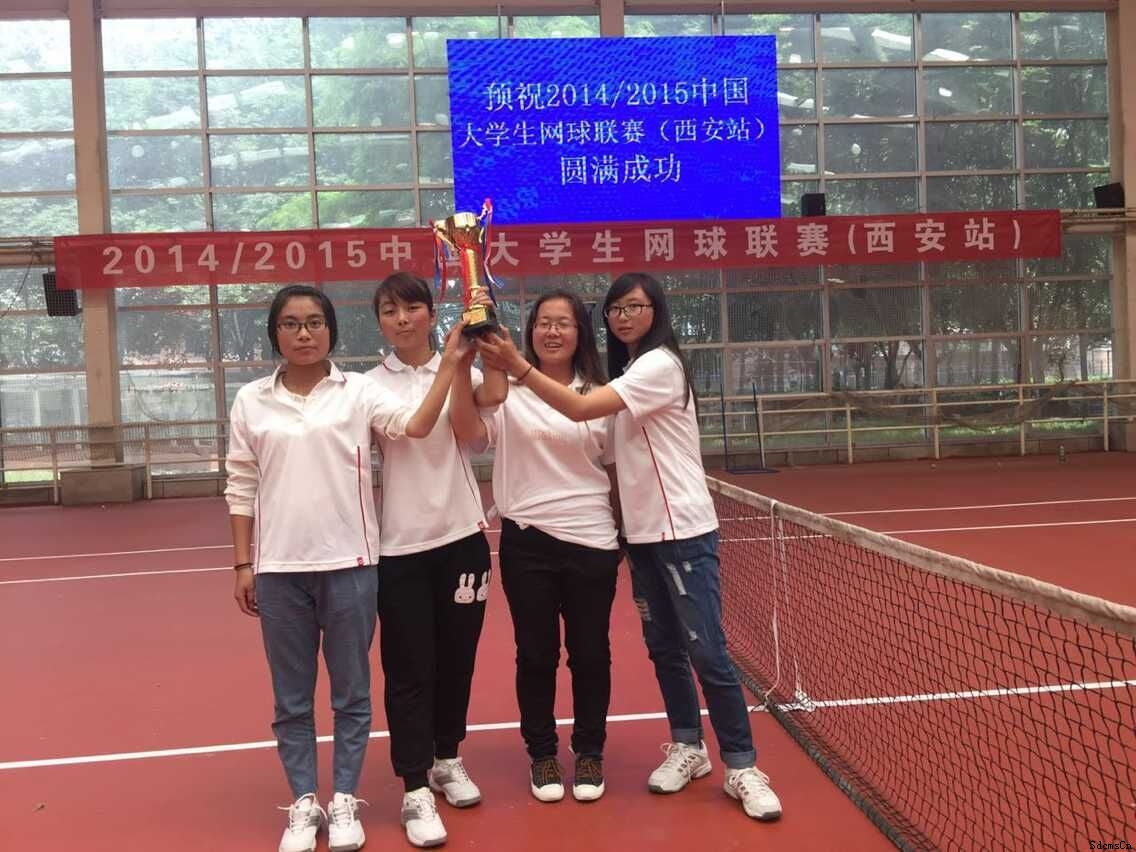 2015年5月15日至17日,我校学生网球队参加了由中国大学生网球协会主办,西安建筑科技大学承办的“2014/2015年全国大学生网球联赛西安公开赛”,在顽强拼搏、不畏强手精神的引领下,在教练员和全体运动员共同努力下,经过激烈的角逐,获得女子甲组团体赛第三名和男子甲组团体赛第五名的好成绩,充分体现出我校大学生运动员攻坚克难、敢于超越的品质。